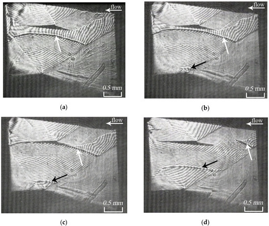 Interference patterns from the (110) KCNSH crystal surface at (a) 18 s, (b) 101 s, (c) 154 s, and 319 s (d) after contact with the solution at ΔT = 1 °C; the KCSH weight fraction in solution is x = 0.08; white arrow—boundary of the dissolving layer; black arrow—the boundary of the growing layer.