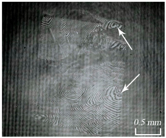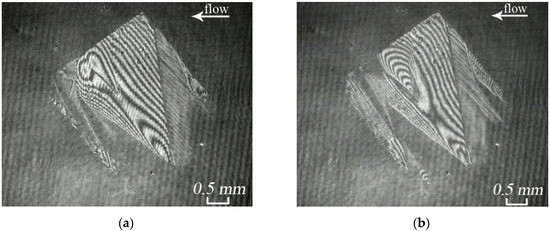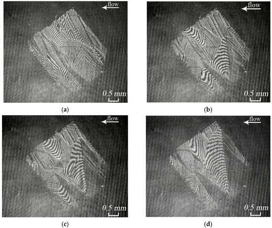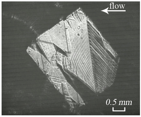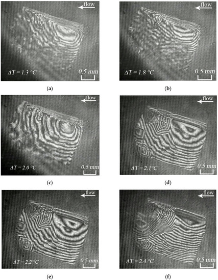 Such a macrostep pattern existed in a narrow range of ΔT ~ 2 ÷ 4 °C, regardless of the flow velocity, and created moiré on the interference image. It quickly disappeared when the supercooling left the indicated ΔT range and the crystal surface became smooth again (Figure 9). A return to the specified interval of supercooling led to the reappearance of the described pattern. The nature of this phenomenon is not clear yet and it is a subject to study.