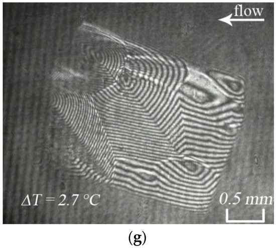 In the first part of the study, it was found that without forced convection of the solution, the reaction of isomorphic replacement happened actively at ΔT ≤ 1.5 °C, while its weak manifestations were observed up to ΔT = 2 °C. So, for this part of the experiments, we started from the supercooling interval ΔT = 1.3 ÷ 2 °C. When the flow velocity varied at supercooling less than 2.0 °С, the regular interference pattern was violated, which indicated the appearance of numerous local areas of isomorphic replacement (Figure 6a–c). At ΔТ > 2.0 °С, the interference pattern was almost restored. It should be noted that neither layer-by-layer dissolution of the hillock tops nor the growth of new phase layers on them was observed in this case.