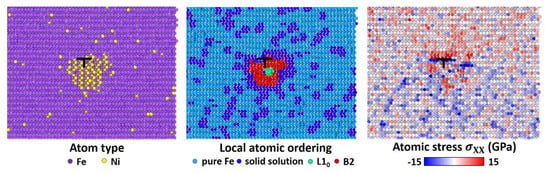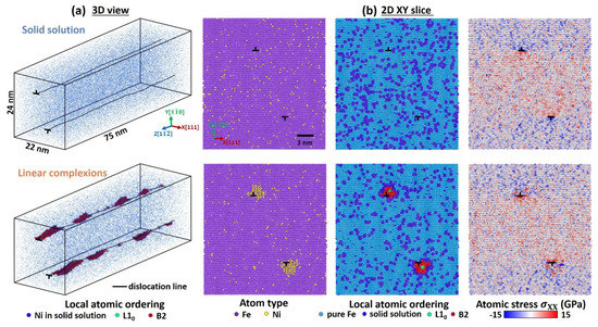 First, an initial simulation cell with two edge dislocations was prepared, as shown in Figure 1a. The dislocations were inserted by removing one-half of the atomic plane in the middle of the sample and relaxing the atomic structure using the conjugate gradient descent method implemented in LAMMPS. Next, 2 at.% Ni atoms were randomly distributed within the sample by replacing Fe atoms, which was followed by MD equilibration with an NPT ensemble (constant number of atoms, constant pressure, and constant temperature) at zero pressure and 300 K temperature for 20 ps. Three thermodynamically-equivalent initial solid solution configurations with different random distributions of solutes were prepared with this procedure, providing a baseline for comparison against samples containing linear complexions. To induce linear complexion formation, the alloy samples were equilibrated at 500 K using the hybrid MC/MD method, which allows for both chemical segregation as well as local structural relaxations. The MC steps were performed after every 0.1 ps of MD relaxation time, using a variance-constrained semi-grand canonical ensemble that can stabilize alloy systems with coexisting phases [33,34]. This method has been used in a number of recent modeling studies to capture complexion transitions in metallic alloys [35,36,37]. The MC/MD procedure led to Ni segregation to the compressive side of the dislocations and then formation of linear complexions in the form of nanoscale precipitate arrays composed of metastable B2-FeNi and stable L10-FeNi phases, as shown in Figure 1. The presence of nanoscale precipitates reduces the compressive stresses on the side of the dislocation with the extra half-plane of atoms (see the zoomed view of the bottom dislocation in Figure 2). More details about the MC/MD procedure for linear complexions in the Fe-Ni system can be found in our previous studies of equilibrium complexion states [5,6]. The MC/MD simulations were determined to be in equilibrium once the rate of evolution of total simulation cell energy fell below 1 eV/ns, even though the procedure was continued for additional time to sample three distinct yet thermodynamically equivalent samples. These samples were then cooled to 300 K over 20 ps with MD for subsequent mechanical testing.