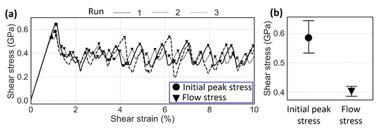 (a) The stress-strain curves for three samples with linear complexions. The initial peak stresses and flow stresses are denoted by circle and triangle symbols, respectively. (b) Mean values and corresponding standard deviations for the initial peak stress and flow stress.