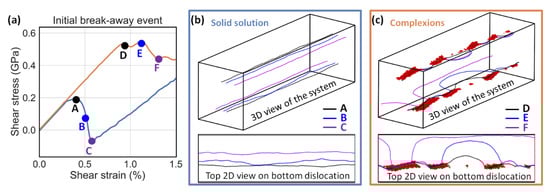 To understand how deformation differs between the solid solution and linear complexion states, Figure 4 presents the initial flow events for representative examples of each of the two sample types. Figure 4a shows the elastic loading and initial flow event, where it is clearly observed that the dislocation can move much more easily in the solid solution sample. Figure 4b shows the dislocation pair at three different simulation times (or, equivalently, applied strains since the strain rate is controlled). The two dislocations in the solid solution remain relatively straight during the motion, with the top dislocation shifting to the right and the bottom dislocation moving to the left. The solutes in the solution act as obstacles that must be locally overcome, leading to very little change in the dislocation shape. The bottom dislocation is shown from a top view in the lower half of Figure 4b, demonstrating the progressive migration that leads to a temporary stress drop as a set of local, solute obstacles are overcome. The local obstacles are easily overcome, which is why the initial peak stress for the solid solution specimens is relatively low. In general, the dislocation in the solid solution sample behaves in a “textbook” fashion, with few features of interest.