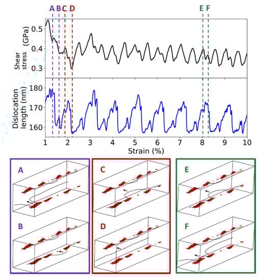 The evolution of the simulation cell shear stress (top, black) and dislocation length (bottom, blue) for the sample with linear complexions, with (A–F) different atomic configurations sampled. The atomic configurations are grouped by different passes of the dislocation that happen due to the periodic boundary conditions of the simulation cell. Black arrows denote the direction of motion for mobile dislocation at the bottom of the cell.