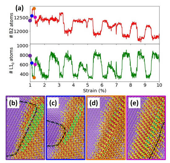 To investigate the complexion structure during the deformation simulation, the number of B2 and L10 atoms in the simulation cell were tracked and are shown in Figure 6a. A cyclic pattern is again observed, suggesting a connection to the repetitive dislocation motion through the cell. Most notable is that reductions in L10 atoms are generally aligned with increases in the number of B2 atoms (and vice versa). Figure 6b–e show atomistic snapshots of important dislocation interactions with a linear complexion particle in an effort to understand this cyclic behavior. In Figure 6b, the dislocation is still pinned next to the L10 precipitate, so the complexion contains the expected L10 core and B2 shell. The dislocation started to pull away from the particle in Figure 6c, and close inspection of the complexion particle shows a reduction in the size of the green L10 region. However, the transition to the B2 structure does not happen immediately, as some time is apparently needed, although short, since it is captured on MD time scales. Figure 6d shows a later time when the dislocation has moved fully away from the particle, and the linear complexion is almost entirely composed of the B2 structure in this frame (a very small number of green L10 atoms remain, but the number is dramatically reduced). This observation provides further support for the concept that the two-phase complexion structure is caused by the dislocation’s hydrostatic stress field. When that stress field is no longer present, a diffusion-less and lattice distortive transformation from an FCC-like structure (L10) to a BCC-like structure (B2) occurs. Figure 6e shows that the L10 region of the precipitate starts to be recovered as the dislocation, and its stress field, arrives at the other side. We note that, while a cyclic behavior is observed in Figure 6a, the number of B2 atoms trend downward as the process continues. This could be a sign that the linear complexion particles are becoming smaller in subsequent cycles (or at least during the transitions from the first few cycles to the steady-state cycling), which would provide an explanation for why the initial yield event is more difficult than later dislocation flow. Figure 6 generally highlights the close connection between the structure of the linear complexion and its interactions with the dislocation. The complexions restrict the dislocation and make it harder to move, while the structure of the complexion relies on the local stress field from the dislocation to find a local equilibrium state. There is, hence, an interdependence of these two defect structures, which truly sets linear complexions apart from traditional obstacles to dislocation motion.