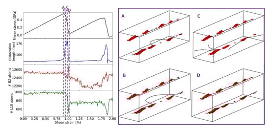 The evolution of the simulation cell shear stress (black), dislocation length (blue), the number of B2 (red), and L10 (green) atoms for the sample with linear complexions deformed at a strain rate of 107 s−1, with (A–D) different atomic configurations sampled on the right side of the figure for the initial break-away event of the dislocation.