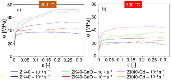 The measured flow curves at 250 °C and 300 °C are shown in Figure 2a,b, respectively. ZK40-Gd and ZK40-CaO exhibit similar behaviour at 250 °C and 0.001 s−1. A fast work hardening occurs once the plastic regime is reached, followed by a progressive decrease in work hardening until a plateau at a true strain of ~0.2. This plateau does not necessarily correspond to the steady-state condition that can be achieved at larger strains. Hradilová et al. [50] investigated alloys of the similar chemical composition of the ZK40-CaO and showed that DDRX could take place at strains larger than 0.3, leading to flow softening. The ZK40 exhibits less pronounced work hardening and lower flow stresses than ZK40-CaO and ZK40-Gd, although the plateau is also reached at a true strain of ~0.2. A decrease in the strain rate to 0.0001 s−1 leads to lower flow stresses and very low work hardening for all alloys. Once the plastic deformation starts, a rapid work hardening is followed by a plateau at strains lower than 0.1. The ZK40 and ZK40-Gd exhibit similar behaviour at 250 °C and 0.0001 s−1, while ZK40-CaO exhibits slightly higher flow stress.