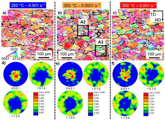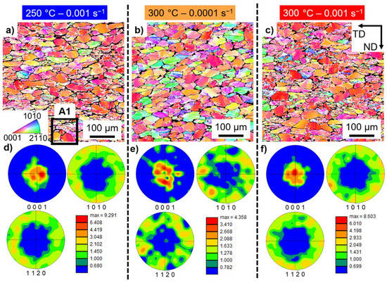 Electron backscattered diffraction results for the ZK40-CaO alloy: (a–c) inverse pole figure maps and (e,f) pole figures. The tested conditions: (a,d) 250 °C and 0.001 s−1; (b,e) 300 °C and 0.0001 s−1; (c,f) 300 °C and 0.001 s−1. Only α-Mg is indexed. Non-indexed regions are highly deformed regions or intermetallic compounds. White and black lines indicate low and high angle grain boundaries, respectively. Area A1 is shown in Figure 14. ND and TD indicate the compression and transversal directions, respectively.