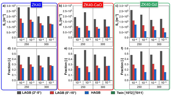 Figure 6 shows the quantification of the overall microstructural features for the investigated conditions. The boundary density () is calculated as the total line length of each boundary divided by the measurement area and is shown in Figure 6a–c for the ZK40, ZK40-CaO and ZK40-Gd, respectively. Higher values of low angle grain boundaries are observed at 250 °C compared to 300 °C. Slightly higher values of low angle grain boundaries are measured at 0.001 s−1 than 0.0001 s−1 for the ZK40 and ZK40-CaO. On the other hand, ZK40-Gd shows slightly lower values of low angle grain boundaries at 250 °C and 0.001 s−1 than those at 250 °C and 0.0001 s−1. ZK40 shows the highest values of of low angle high angle grain boundaries, while comparable values are found for ZK40-CaO and ZK40-Gd.