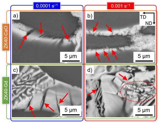 Backscattered electron micrographs of the fractured intermetallic compounds in: (a,b) ZK40-CaO; and (c,d) ZK40-Gd, deformed at 0.001 s−1 and: (a,c) 250 °C; and (b,d) 300 °C. Red arrows indicate cracks. The fragmented intermetallic compound is indicated by the dashed red ellipse. ND and TD indicate the compression and transversal directions, respectively.