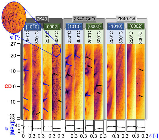 Despite the comparable azimuthal-strain plots at 250 °C in Figure 8 for the investigated conditions, there is a significant difference between 250 °C and 300 °C: new spots are observed at 300 °C, as highlighted in the magnified area, and is more pronounced for the ZK40. The spotty characteristic of the azimuthal-strain plots can occur due to: