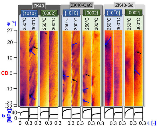 Azimuthal-strain plots for the three investigated alloys tested at 250 °C and 300 °C for the strain rate of 0.001 s−1. Blue arrows indicate the intense spread of orientation in the diffraction rings and the decay in the intensity of the diffraction signal. Black arrows indicate the bending of the timelines. CD indicates the compression direction.