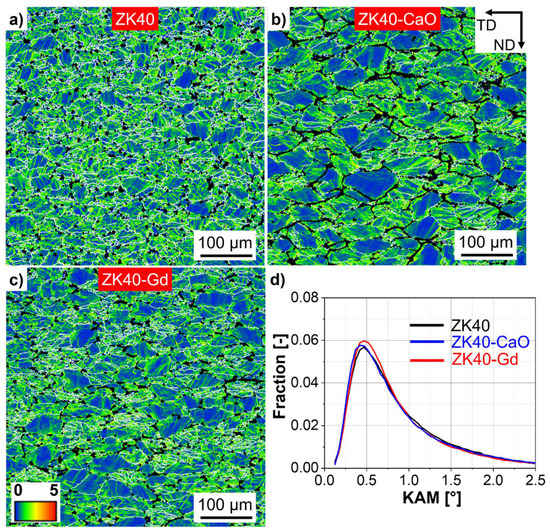 Kernel average misorientation maps for the alloys deformed at 300 °C and 0.001 s−1: (a) ZK40, (b) ZK40-CaO and (c) ZK40-Gd. Kernel average misorientation distributions for the three alloys showed in (d). Only α-Mg is indexed. Non-indexed regions are highly deformed regions or intermetallic compounds. White lines indicate high angle grain boundaries. ND and TD indicate the compression and transversal directions, respectively.