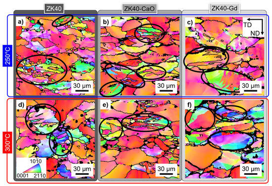 Inverse pole figure maps for the deformed alloys at 0.001 s−1: (a,d) ZK40; (b,e) ZK40-CaO; (c,f) ZK40-Gd; and: (a–c) 250 °C, (d–f) 300 °C. Only α-Mg is indexed. Non-indexed regions are highly deformed regions or intermetallic compounds. Black lines indicate high angle grain boundaries. Black ellipses indicate regions that resemble twins. ND and TD indicate the compression and transversal directions, respectively.