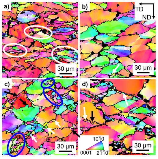 Inverse pole figure maps for the deformed alloys at 0.0001 s−1 and: (a) 250 °C, (b–d) 300 °C; for the: (a,b) ZK40; (c) ZK40-CaO; (d) ZK40-Gd. Only α-Mg is indexed. Non-indexed regions are highly deformed regions or intermetallic compounds. Black lines indicate high angle grain boundaries. Black arrows indicate small grains at prior grain boundaries. Blue ellipses indicate regions that resemble a twin shape and also new grains. ND and TD indicate the compression and transversal directions, respectively.