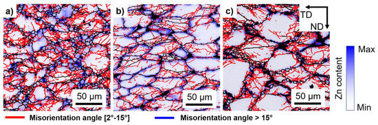 Figure 1g–i shows that small content of Ca, and Gd is present in the α-Mg matrix and that the segregation of Zn and Zr is pronounced. The ZK40 alloy shows mostly higher segregation of Zn. Figure 13 shows the EDXS maps measured simultaneously with EBSD for the Zn segregation in the deformed samples at 300 °C and 0.0001 s−1. The segregation of Zn is still present after deformation and more pronounced for the ZK40, Figure 13a. While the investigated alloys by Hoseini-Athar et al. [28] contained isolated intermetallic particles, the investigated ZK40-Gd has a semi-continuous network of intermetallic compounds along the grain boundaries. Due to the higher strength, the network of (Mg,Zn)3Gd2 withstand an elevated part of the stress until the network starts to fragment (Figure 7). Then, the load is progressively transferred into the α-Mg, leading to flow softening [17], as shown in Figure 2. Therefore, until the semi-continuous network of (Mg,Zn)3Gd2 withstands the load, the plastic deformation is limited in the α-Mg matrix. Furthermore, the α-Mg deforms near the intermetallic compounds, evident by the formation of boundaries preferentially along grains boundaries. Therefore, the formation of a semi-continuous network of (Mg,Zn)3Gd2 reduces the role of DDRX in ZK40-Gd.