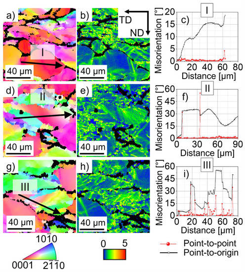 Finally, the mechanisms of microstructure formation and the role of dynamic recovery are derived from the interpretation of the microstructure features, Figure 14. Figure 14a,d,g shows a notable misorientation spread in the inverse pole figure maps shown as a progressive change in orientation within each grain. Besides, Figure 14c illustrates the misorientation profile I with variations in misorientation without the formation of boundaries. The kernel average misorientation map (Figure 14b) also indicates diffuse boundaries within the observed grain, indicating an early degree of the reorganisation of dislocations via dynamic recovery. The misorientation profile II in Figure 14f shows a region that resembles the morphology of a twin. The boundary misorientation is far from 90° (typically for the tensile deformation twins), indicating that the feature cannot be classified as a twin. However, it suggests that it corresponds to a twin formed at early stages of deformation that further deformed forming misorientation spread and boundaries within the twinned region, as proposed by Hradilová et al. [50]. The kernel average misorientation map in Figure 14e shows a diffuse pattern within a parent un-twined grain, indicating the parent grain also accommodates further plastic deformation.