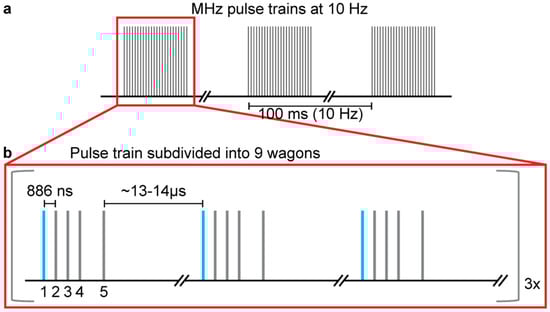 Data collection was performed similarly as in previous experiments [,]. The experiment was performed at the SPB/SFX instrument [] of EuXFEL (Proposal 2156, March 2019) with the accelerator producing ten pulse trains per second with a base intra-train rate of 1.129 MHz. During this experiment, up to 176 pulses/train were available to the SPB/SFX instrument. For a continuous train of pulses, only the first pulse in the train probes a jet segment guaranteed to be unaffected by previous pulses. We augmented data acquisition efficiency of guaranteed undamaged data by making use of bunch patterning. Each X-ray train was subdivided into 9 X-ray pulse bursts (“wagons”) running at MHz intra-burst repetition rate (Figure 1). 14–15 pulses between wagons were dropped such that the last pulse of each wagon interacted with the jet 13–14 µs before the arrival of the first X-ray pulse of the subsequent wagon (Figure 1).