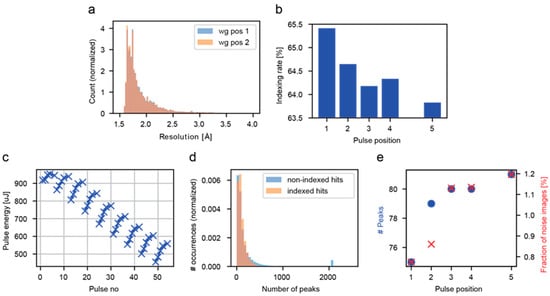 Comparison of data quality: first vs. subsequent pulses in a wagon. (a) Histogram of the resolution (at signal-to-noise ratio (SNR) 3) of diffraction data collected using pulses 1 and 2 of all X‑ray wagons. (b) Indexing rate as a function of pulse position averaged over all wagons. (c) Average pulse energy for all pulses in the X-ray trains. (d) Histogram of the number of peaks detected in diffraction patterns that can (orange) and cannot (blue) be indexed. None of the indexed diffraction patterns contain more than 1140 peaks. (e) Average number of peaks (blue circles) and fraction of hits containing more than 1140 peaks (red crosses) as a function of pulse position in a wagon, averaged over all wagons. (a–e) show results from diffraction data of lysozyme microcrystals.