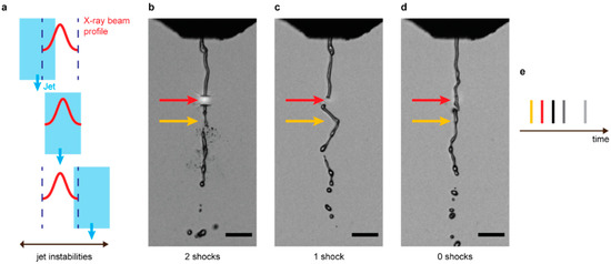 Jet stability can influence the observed effect of previous pulses on data quality. (a–d) The liquid microjet carrying the microcrystals can show significant deviations from the well-behaved straight geometry shown in (b). Sideways wiggling of the jet (c,d), or similarly, variations in XFEL pointing, can cause the XFEL beam to partially or entirely miss the jet (a). Jet instabilities are more pronounced with relatively large microcrystals or high crystal densities and affect not only the apparent hit rate but also the number and strength of shock waves launched by one pulse to affect later ones. For example, data collected with the third pulse in a train/wagon can have experienced two (b), one (c) or zero (d) shocks depending on the detailed motion of the jet as the individual pulses arrive. The yellow and red arrows indicate the positions along the jet where the first and second pulse of the wagon are expected to hit. Whether a given X-ray pulse hits the jet and launches a shock wave can be examined by analyzing the intensity of the water ring in the diffraction images. (b) Two gaps at the expected interaction regions (on the jet) of the first and second pulse are clearly visible in the continuous jet. Both pulses most likely intersected the jet and launched shock waves propagating upstream. (c) There is no gap visible at the jet position where the first pulse intersects the jet (yellow arrow), it missed the jet due to wiggling. However, there is a gap visible at the location where the second X-ray pulse is expected to interact with the jet (red arrow). Thus, sample probed by the third pulse was subjected to one shock wave. (d) Wiggling of the jet (in the plane perpendicular to the X-ray beam axis) precludes interaction of either the first or the second pulse with the jet. No shockwave is launched. (e) Pulse pattern within a wagon.