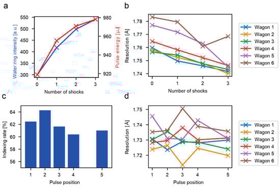 As in previous work [,], we first merged and sorted SFX patterns according to their position within X-ray wagons, then compared “shock-free” and “shocked” datasets. With increasing number of previous pulses, and thus increasing shock exposure from previous pulses, the resolution appeared unchanged (indicating no damage, Figure 2a), yet the indexing rate appeared to decrease (indicating damage, Figure 2b). This quandary prompted a thorough and detailed examination of all metadata, which revealed numerous intertwining issues.