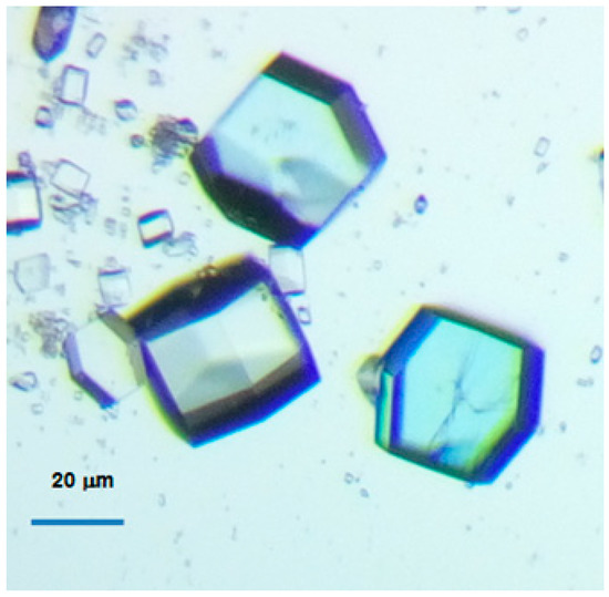 The protein crystal (Figure 2) was mounted on the goniometer head in the micro-diffractometer with the assistance of a robotic arm (Irelec, Saint-Martin-d’Hères, France). The crystal was continuously cooled to 100 K using nitrogen gas through a cryostream blower (Oxford Cryo Systems, Oxford, UK). A beam-stop was placed immediately before the detector to block the primary X-ray beam. The diffracted signal was recorded by an Eiger X 1M (Dectris, Baden-Daettwil, Switzerland), which has an active size area of 77.2 × 77.9 mm2. The detector was mounted at distances 50 mm or 60 mm downstream from the sample crystal in order to optimize the resolution and to minimize the background scattering (noise). The highest resolution provided by the employed geometry was 1.59 Å at the detector edges and 1.124 Å at the corners.