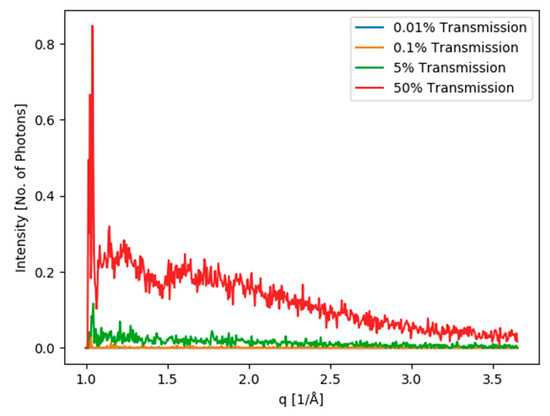Radial average of the X-ray diffraction intensities determined at 1 kHz operational frequency of frame readout of the Eiger X 1M detector for different transmissions and in the lack of protein crystals, i.e., the background coming from the air scattering and other factors. Y-axis gives the radial average of photons counted by the detector per 1 ms exposure time per frame. The average is calculated for one typical background frame.