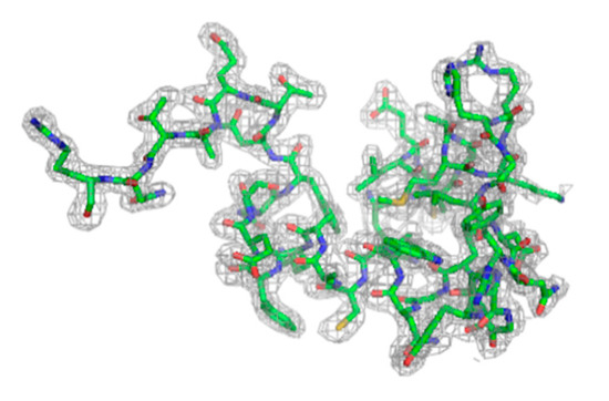 2mFobs- DFcalc electron density (contoured at 1σ) for residues 5–45 of the lysozyme for data collected at 2.4 kHz frame rate (dataset L12.4_5).