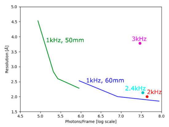Overall, Table 1 demonstrates that high-quality data can be obtained at a relatively low flux or high repetition rates. The obtained plot of resolution versus the input photon flux for 1, 2, 2.4 and 3 kHz frame rates are presented in Figure 8. As expected, the resolution depends on the photon flux for all investigated cases. The relatively lower resolution for the dataset at 3 kHz we suspect is attributed to various mechanical instabilities, such as goniometer rotation and/or cold streamflow, as noted above.