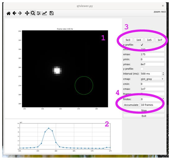 Graphical control interface of the JUNGFRAU detector developed for our experiments. (1) The main panel shows an enlarged image of the direct beam. The centre of the detector surface is shown as a green circle. (2) The one-dimensional beam profile below enables fast focussing of the diffraction pattern on the detector surface by minimising the standard deviation of the beam profile. The panel on the right sets the dimensions of the profile and the contrast of the main panel. (3) The top row has presets for the contrast. (4) The Accumulate button takes a screenshot.