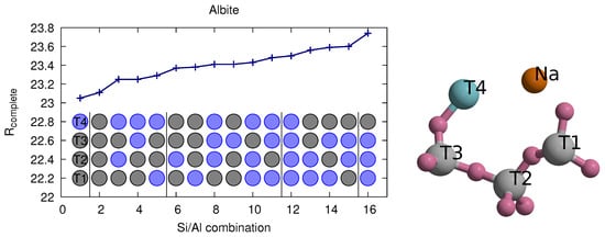 R1 and Rcomplete [] values of albite for all 16 combinations of silicon and aluminum across the four T-sites of albite. The first column lists the number of T-sites modelled as aluminum, the following four columns list which T-sites were modelled as aluminum and silicon respectively. Atom coordinates and one isotropic ADP value were refined for each atom site without restraints, and until convergence was reached (zero parameter drift reported by SHELXL). Values in parentheses for strong reflections ().