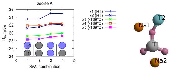 R1 and Rcomplete [] values of zeolite A, measured at room temperature and −189 °C (as indicated). The second T-site is the aluminum site, i.e., the first column contains the correct combination Si/Al. All four possible combinations of modelling the two T sites as silicon and aluminum, respectively. Atom coordinates and one isotropic ADP value were refined for each atom site without restraints, and until convergence was reached (no parameter drift). Number in brackets calculated from strong reflections ().