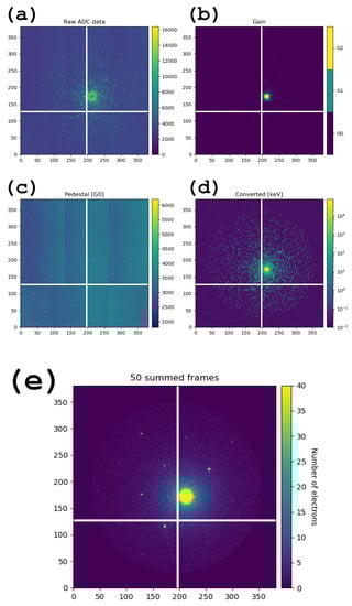 To convert the output of the detector, which consists of a 14 bit ADC value and 2 bits of gain data per pixels, we need three different calibration constants, one for each gain (G0, G1, G2), and three offsets for pedestal correction. The detector was calibrated using the standard procedure before mounting it on the microscope. The calibration consists of an absolute calibration of G0 with 8 keV photons from Copper X-ray fluorescence and relative calibrations for G1 and G2 using backplane pulsing and the internal current source [].