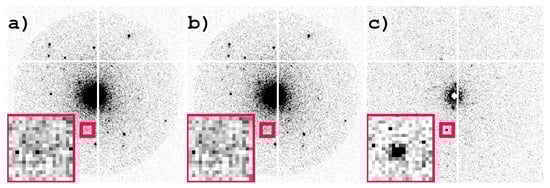 Noise reduction by application of a 10 keV threshold. (a) Frame with 10 keV threshold applied, (b) frame without threshold applied, (c) frame (a)–frame (b) reveal “hidden” reflections. The insets show a magnified version of the region of interest. Images including background subtraction with ADXV [].