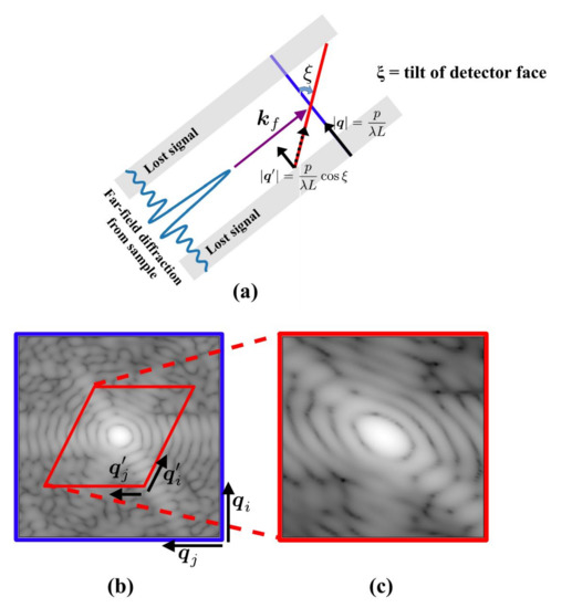 We now refer to the schematic in Figure 3. In Figure 3a, we see a simplified one-dimensional detector arranged to capture the peak of a Bragg reflection at its center, but tilted away from the imaging plane by an angle . Here, we denote the distance between the object and the center of the detector as L and the pixel pitch as p. This arrangement renders the extent of angular space queried by the detector smaller by a factor of (note the region of angular information “lost” to the BCDI measurement). The Fourier space norm of the pixel step is no longer , as shown in [23], but . The scattered intensity in the region of lost information does not contribute to the acquired signal. Even in the case of a high signal-to-noise ratio (SNR), this would result in a measurement with missing higher order Fourier components and therefore a reconstruction with necessarily lower spatial resolution. A more general treatment of this one-dimensional detector case is found in [25].