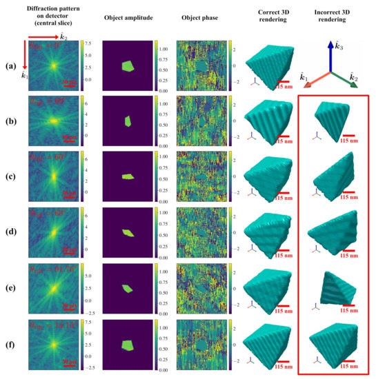 In each case, the tilt-corrected pyramid isosurface is shown along with the corresponding isosurface when one disregards the detector tilt (fourth and fifth images in each row, respectively). More specifically, the fourth image in each row corresponds to the correct real-space sampling basis , obtained from Equation (1) after properly accounting for the detector tilt (the tilt corrections in each case being given by Equations (3) and (4)). The fifth image in each row of Figure 4 corresponds to the inferred object without accounting for the detector tilt. Clearly, the tilt-corrected isosurface agrees with the original pyramid in Figure 4a in terms of morphology and orientation.