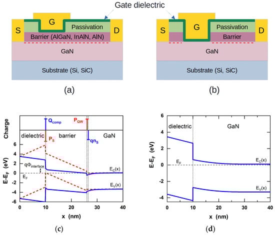 - Ťapajna, M.; Kuzmík, J. A comprehensive analytical model for threshold voltage calculation in GaN based metal-oxide-semiconductor high-electron-mobility transistors. Appl. Phys. Lett. 2012, 100, 113509. [Google Scholar] [CrossRef]