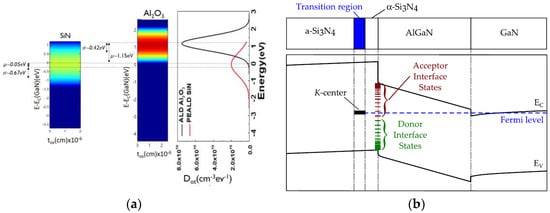 - Hori, Y.; Yatabe, Z.; Hashizume, T. Characterization of interface states in Al2O3/AlGaN/GaN structures for improved performance of high-electron-mobility transistors. J. Appl. Phys. 2013, 114, 244503. [Google Scholar] [CrossRef]
