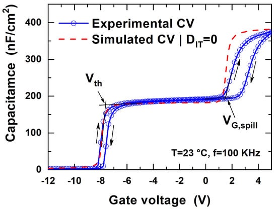 - Heiman, F.P.; Warfield, G. The effects of oxide traps on the MOS capacitance. IEEE Trans. Electron Dev. 1965, 12, 167–178. [Google Scholar] [CrossRef]