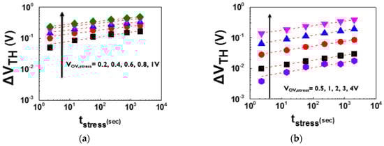 - Lagger, P.; Reiner, M.; Pogany, D.; Ostermaier, C. Comprehensive study of the complex dynamics of forward bias-induced threshold voltage drifts in GaN based MIS-HEMTs by stress/recovery experiments. IEEE Trans. Electron Dev. 2014, 61, 1022–1030. [Google Scholar] [CrossRef]