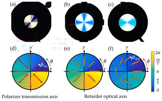 Next, we describe the two kinds of optical devices considered in this work—a radial polarizer from CODIXX [30] and two static polymer LC q-plates from Thorlabs with q = 1 (model WPV10-633) and q = 1/2 (model WPV10L-633) [31]. We include analytical expressions of their Mueller matrices, which are not encountered in works on vector beams that most often use the Jones formalism. As shown in Figure 2, the most characteristic feature of these devices is the azimuthal orientation of the transmission axis (radial polarizer, Figure 2d) and of the optical axis (q-plates, Figure 2e,f). The q-plate of q = 1/2 has a mark in its mount that indicates the zero-degree optical axis, which we have aligned in the x-axis orientation, as shown in Figure 2f.