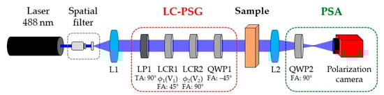 In this section, we describe the optical system of our imaging MM polarimeter shown in Figure 3. As light source, we use the 488 nm line of an air-cooled Ar-Kr laser (CVI/Melles Griot, Mod. 35-LTL-835-240, Albuquerque, NY, US). A spatial filter, consisting of a 20× microscope objective (Newport, M-20×, North Logan, UT, US) and a pinhole aperture (Newport, 900PH15, North Logan, UT, US) of 15 μm diameter cleans up the light beam, which is then collimated by a lens L1 (f1 = 75 mm). The LC-PSG is built by a linear polarizer (Thorlabs, LPVISE200A) with its transmission axis (TA) in the vertical direction, followed by two liquid–crystal variable retarders (LCR) from ArcOptix [36], oriented at 45° and 90°, respectively, and a QWP (Thorlabs, AQWP05M600, Newton, NJ, US) with its fast axis (FA) at −45°. The two commercial LCRs employed were calibrated at 488 nm wavelength and their retardance curve as a function of voltage, and were obtained. These curves and the driving voltage values of LCR1 and LCR2 that were required to generate the six standard states of polarization—horizontal (H), vertical (V), ±45° linear polarizations, and right- (RCP) and left-handed (LCP) circular polarizations, are given in [28]. The polarization state analyzer (PSA) consists of a second QWP (Thorlabs, WPQ05M488, Newton, NJ, US) with its FA vertically oriented and a Kiralux™ Polarization Camera (Thorlabs, CS505MUP, Newton, NJ, US). This camera has a monochrome CMOS Sensor of 5 megapixels with a wire grid polarizer array that consists of a repeating pattern of polarizers with their transmission axes at 0°, 45°, −45°, and 90°. Therefore, QWP2 is only placed in the PSA when the circular polarization states need to be analyzed. The sample is placed between the LC-PSG and the PSA, and the sample plane is imaged on the camera by a second lens L2 (f2 = 150 mm).