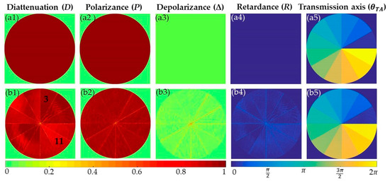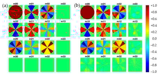 The experimental MM is shown in Figure 4b. It holds very good agreement with the numerical one. A certain amount of noise is apparent in the elements of the last row and column of the MM in Figure 4b. Element presents the maximum absolute error averaged in the whole area (0.11). The absolute error is 0.22 when averaged over 60 × 60 pixels in the blue region in . Note that the borders between the segments of the radial polarizer are clearly observed in the images of the bottom row of Figure 4b, particularly in element . This means that our polarimetric system is very sensitive in detecting details in the sample. These results are comparable to those reported for a radial polarizer patched with eight sectors [43].