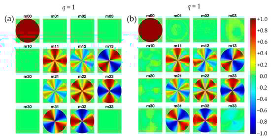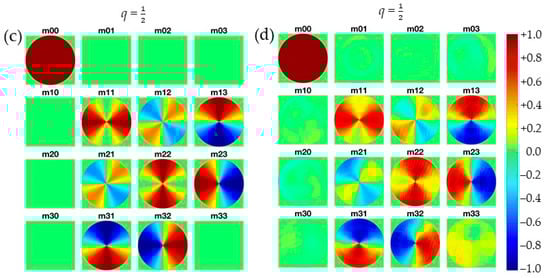 Let us describe the polarimetric response of the q-plates of q = 1 and q = 1/2. Previous calibrations indicate that they have a retardance value very close to at 488 nm [33]. The numerical MM of the q-plates of q = 1 and q = 1/2 are obtained by using Equation (6); they are shown in Figure 6a,c, respectively. In this case, the symmetry conditions of their MM elements are , , , and . Except for , the first row and column of the MM image are null, i.e., , as corresponds to pure retarder systems. Following the previous experimental procedure, the experimental MM are obtained for both q-plates of q = 1 and q = 1/2, which are shown in Figure 6b,d, respectively. The experimental MM are consistent with the numerical ones and the symmetry conditions hold very well. The maximum average absolute error, attributable to the experimental noise is 0.14 and occurs in element m33. The number of lobes in the Mueller matrix elements depends on the order of the q-plate. For instance, element for m11 the q-plate with q = 1 has four lobes, while for q = 1/2 it only has two lobes.