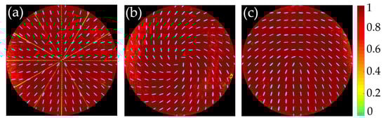 Figure 9 shows the experimental polarization maps of CVBs generated with the three devices used in this work. In the three cases we consider illumination with right circularly polarized light of wavelength 488 nm. From the experimental output Stokes parameters the polarization map of each vector beam was retrieved and the results are shown in Figure 9. The images show the calculated polarization ellipses drawn on the captured intensity image. The radial polarizer produces a radial beam of order , which is shown in Figure 9a. On the other hand, the q-plates generate a slanted beam of order , where Figure 9b,c correspond to the q-plate of q = 1 and q = 1/2, respectively.