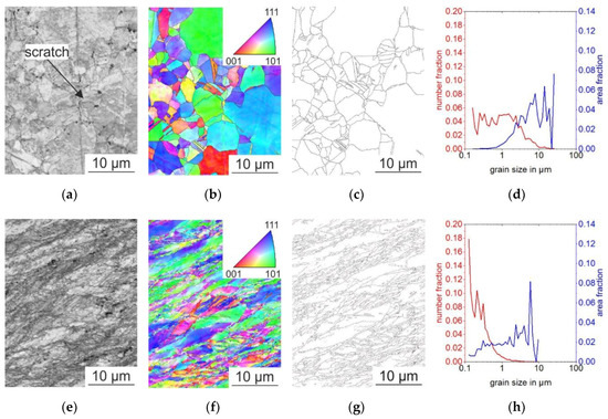 - DIN ISO 13067:2015-12. Microbeam Analysis—Electron Backscatter Diffraction—Measurement of Average Grain Size; Beuth Verlag GmbH: Berlin, Germany, 2015. [Google Scholar]