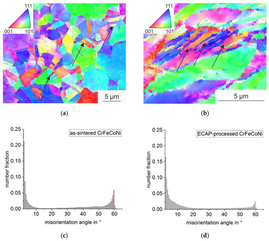 - Microstructural investigations (by optical microscopy and EBSD) confirm a considerable grain refinement. ECAP-processing leads to a majority of grains with a size below 1 µm. The corresponding microstructure is characterized by elongated grains due to the induced simple shear deformation. Differently distorted areas are found. Fine-grained areas alternate with areas characterized by much coarser grains. Both areas are arranged under an angle of approximately 27° (to the pressing direction). The thickness of the large twins (up to several µm) in the as-sintered material was reduced by ECAP to approximately 100–300 nm. From the present study, it is assumed that the dominating deformation mechanism in the investigated CrFeCoNi HEA during ECAP-processing is dislocation slip.