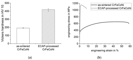 - The mechanical properties (hardness and tensile properties) are significantly increased due to the introduction of defects and the formation of HAGBs during ECAP. Compared to a cast condition of the same alloy, the sintered condition shows significantly different mechanical properties. For instance, the YS of the as-sintered HEA is 150% higher than that of a cast counterpart (reported in the literature). A further significant increase of YS and UTS is found after a single pass of ECAP. The YS is increased to more than 1 GPa. A comparison of both conditions (as-sintered, ECAP-deformed) reveals a fundamentally different strain hardening behavior of CrFeCoNi, which is discussed in detail.