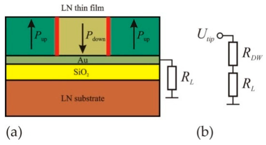 The schematic presentation of a domain written by AFM-tip voltage in LNOI (a) and the equivalent circuit of the domain writing (b). In (a) the red vertical lines represent DWs, the horizontal green and yellow layers show the metal and SiO2 ones, respectively; in (b) RDW is the DWs’ total resistance. In (a,b) RL is the load resistor.