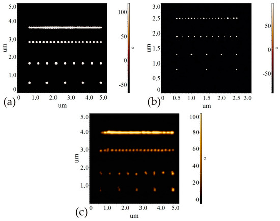 In 500 nm thick films the threshold Utip of the domain appearance is of 18 V; for thicker films it is somewhat larger. Figure 2a presents the results of writing at tp = 0.1 ms, Utip = 35 V. Qualitatively similar panels are visualized on writing in the ranges of Utip > 22 V and tp ≥ 0.1 ms (the shortest experimental tp). The exposure characteristics of the domain diameter D(Utip) and D(tp) were presented in [19]. In agreement with [19,20], the written domains are fully stable. The dependences of the domain sizes D(Utip) and D(tp) are not affected by the inter-domain spacing. A specific feature of these patterns is the domain merging as the distance between the neighboring DWs is decreased (the upper rows in Figure 2a). This merging ignores the domain sizes and occurs when the distance between the neighboring DWs becomes lesser than 20–30 nm. The domain merging phenomenon was described in detail in our preceding publications [19,20].