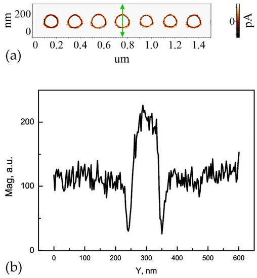 These experiments were performed by writing a row of circled domains by means of step-by-step AFM-tip movement. Figure 3a,b present, respectively, the amplitude PFM image of a fragment of this row and the scanline of an individual domain. The domains were written by Utip = 27 V, tp = 500 ms; the specified distance between the writing points was of Λ = 100 nm.